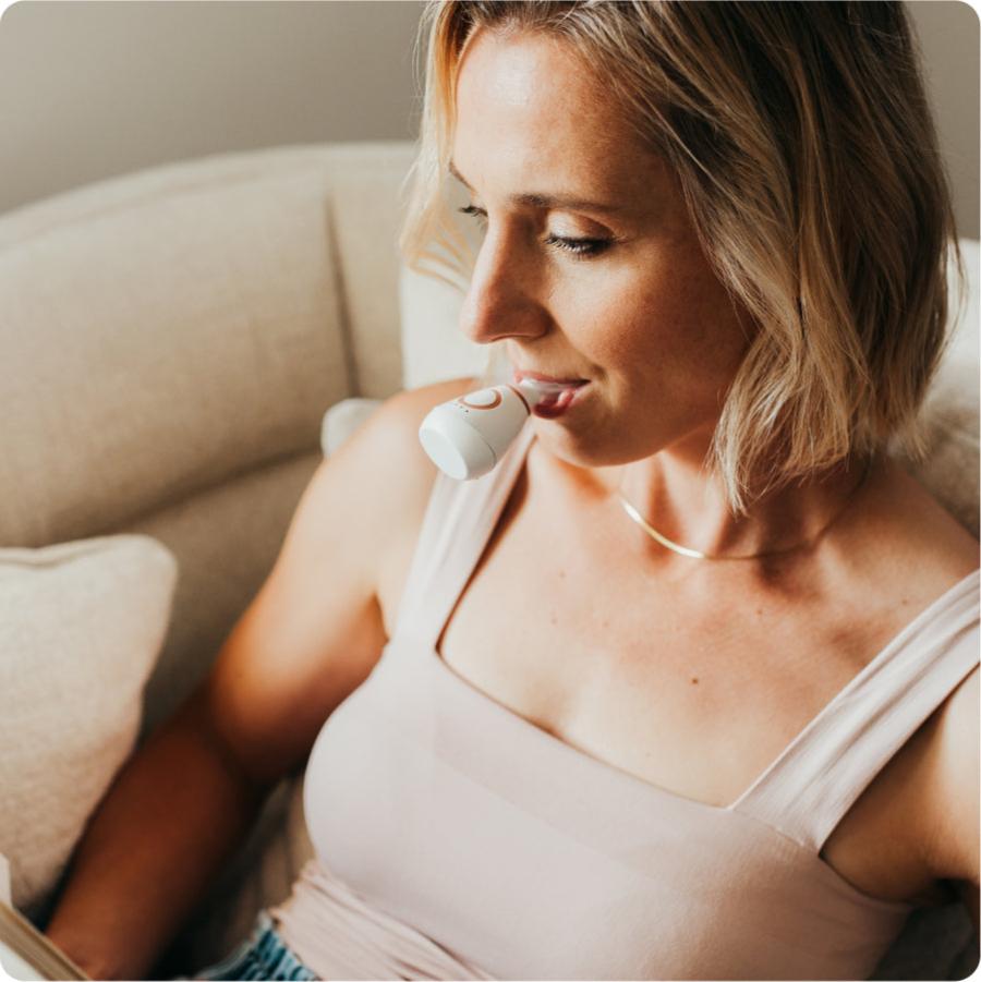 upLift 5 is the most convenient beauty device available. It can be used anytime and anywhere even while doing tasks, between meetings, relaxing on the couch, or in bed. Just bite down on the mouthpiece with moderate pressure and press the on button. In five minutes, the upLift 5 will automatically shut off, signaling the end of your session. You may then return the device to its included charging and travel case.